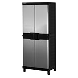 Huge storage capacity. Polypropylene frame and legs. Multi-layer coated metal fronts on doors. 3" deep door with pegboard and 6 multipurpose bins. Pegboard holes on cabinet sides. 3 reinforced resin shelves with a metal rod. Assembly with only a screwdriver. Adjustable poly feet. Product specifications: 74" H., 20" D., 30" W. Weight capacity (maximum 390 lb.): doors 20 lb. each, shelves 55 lb., bottom shelf 100 lb., top 85 lb.